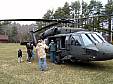 To enable the chapter's trails committee to replace some worn-out log bridging over a stream and its approaches on the Narragansett trail near Long Pond/Ell Pond, an efficient means of bringing the lumber materials to the site were needed. Manually carrying the lumber from the trailhead to the bridge site was ruled out, due to the extensive amount of materials and the difficult trail terrain. Bringing the materials in by boat on Long Pond or sliding the material on the ice on this Pond during the wintertime was investigated and ruled out as not being possible. The only other option was to airlift the materials. The Army National Guard was contacted in late 2006 and an airlift was initially scheduled in 2007, but was ultimately postponed due to National Guard support personnel being unavailable on the scheduled date. Eventually, the airlift was re-scheduled to March 27, 2008 and the airlift was successfully carried out. The lumber was brought from the lumber supplier to the parade field at Boy Scout Camp Yawgoog and divided into three bundled loads. The Blackhawk helicopter airlifted each of loads (in three separate flights) the one mile distance to the drop point, a rock ledge above and next to the trail near the bridge site. The loads were lifted from the ground and eased to the ground using a sling and hook method, to enable the helicopter to hover above the loading/unloading points, during the transfer of the materials. This was the first time in the history of our Chapter, that we have moved trail project materials by this method. (CSchafer)