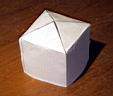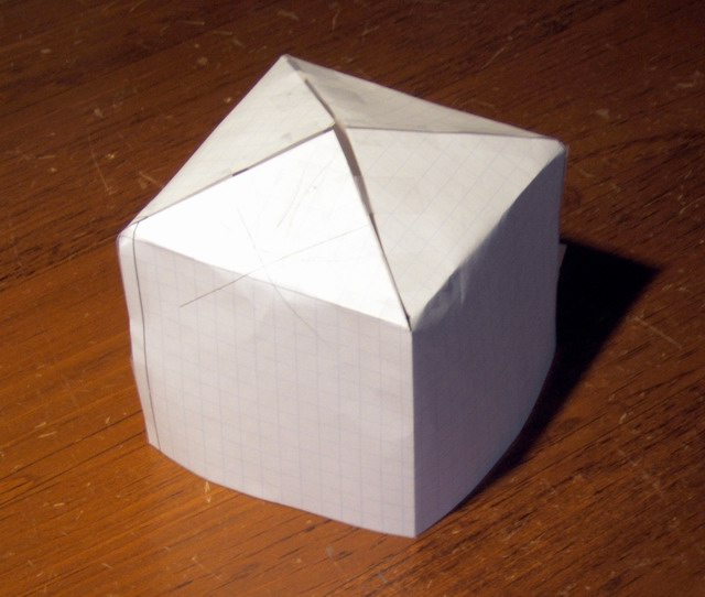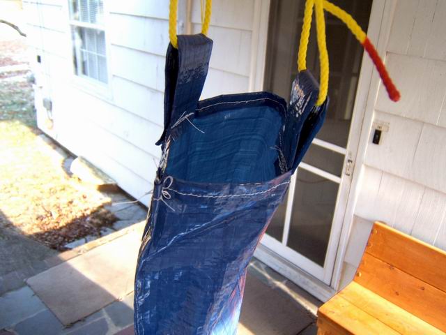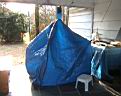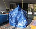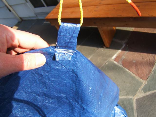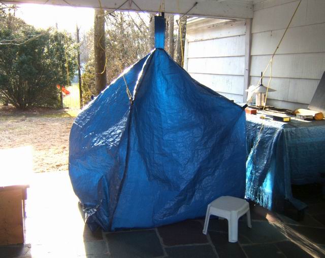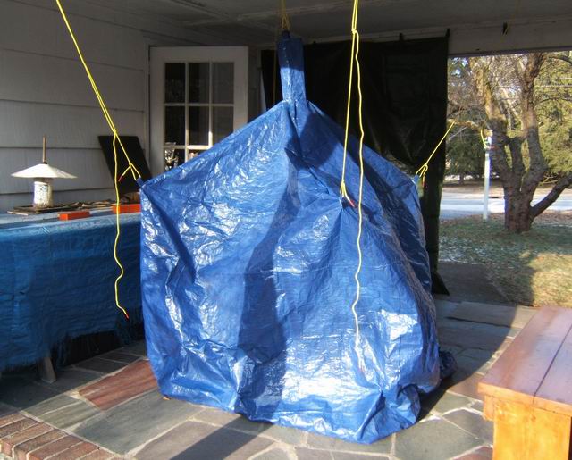 This project was a chance to construct a cheaper version of a commercial emergency shelter costing over $100. Using common blue tarp material reduces the cost considerably, and doing it yourself makes it even cheaper. The vinyl/polyester tarp material sews up quite nicely. I decided that for a 4 person shelter, two 8 ft x 10 ft tarps would be optimal. I was able to get the tarps on sale at a local discount store (Bldg 19) for $1.89 each, normally about $4 each. Either way, considering that we are dealing with about 6 yards of wide coated material, it would cost about 6 yds x $7.50 /yd = $50 incl s&h using commercial coated nylon. So I got by with $4. You must also have access to a sewing machine. I use commercial Dacron sail thread obtained from a sail loft in the area. A model of the shape is shown below., along with an attempt to hang it within my breezeway to show the size of the prototype shelter. The final shelter rolled up weighed only 2 pounds. On the good days can double as a beach blanket.