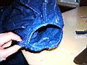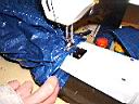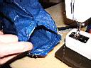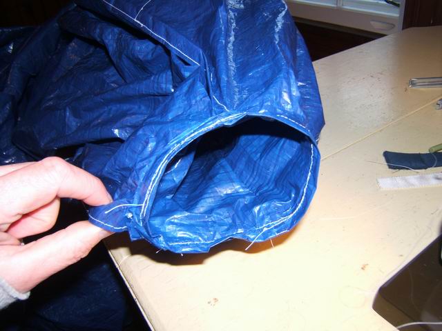 The vent on this prototype was sewn on the top of the shelter mainly to cover up the offset hole. I chose to make a tunnel vent and sew it onto the hole at the peak. I enlarged the hole to fit the vent. To do this you need a sewing machine that can do sew sleeves as seen in the photos below. It was a sloppy complicated sew because the blue tarp material does not stretch. In retrospect I would not recommend this method. It would be easier to just sew up the offset hole and forget about neatness.