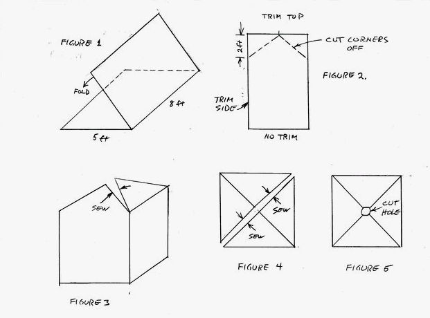 For each tarp you will sew one ridge seam of the peak as seen in Figure 3. You will need alot of room to handle the tarp material on your sewing table. I used a flat folded seam for strength. Try to get the seam to come out even at the peak so that things will align later.